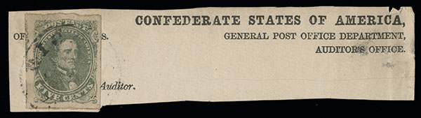 #1c, 5c Olive green, Stone 1, used single with large to huge margins, tied to piece of official business envelope with imprint of the Post Office Department by Richmond c.d.s., extremely fine and attractive.