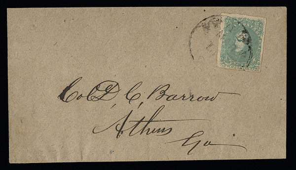 #3, 2c Green, four ample to large margins with a bare trace of edge toning, tied to clean drop cover by "Athens/Ga/Mar 11" c.d.s., very fine; an attractive usage for which this stamp was intended.