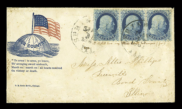 #18, 1c Blue, Ty. I, well centered horizontal strip of three tied by Springfield, Ill., May 15, 1861 c.d.s. postmarks on "Our Country", flag, globe and verse patriotic cover to Greenville, Ill., interesting manuscript notation "I didn't have any three cent stamps (Jo)" just below stamps, light pencil mathematical doodles on reverse, very fine; a scarce and attractive usage of the 1857 1c Type I on a patriotic cover; an off-cover used strip of three of #18 catalogs $2,100.00.
