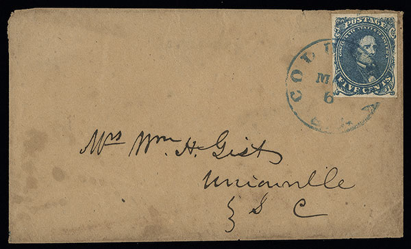 #4 var., 5c Blue, "popeye" variety, a rather striking variety lacking the eyelash line in Davis' right eye causing the the pupil and white of the eye to be extra prominent, stamp with fresh deep color and wide balanced margins, tied to cover to Unionville S.C. by blue "Columbia/S.C./May 6" c.d.s.,small portion of backflap missing, very fine;