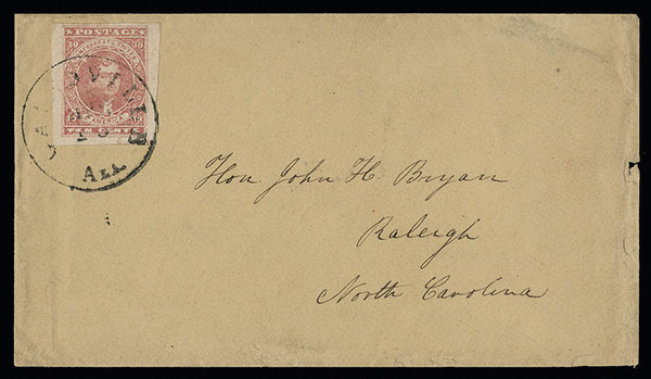 #5, 10c Rose, attractive single with an ample margin at top and huge margins on the other three sides, tied to cover to Raleigh, N.C. by "Gainsville/Ala/Apr 13" c.d.s., minor edge erosion along the bottom and right edges of the cover, otherwise very fine with an extremely fine stamp; 1997 PF certificate.