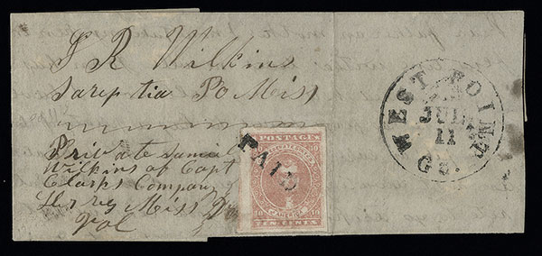 #5, 10c Rose, lovely single with large to extra-large margins, tied by "Paid" cancel to small folded soldier's letter, a private in Capt. Claps Co., 3rd Reg. of the Mississippi Volunteers, posted to "Sareptia" (Sarepta), Miss. with black "West Point/Ga./Jul 11" c.d.s., very fine and interesting usage;.