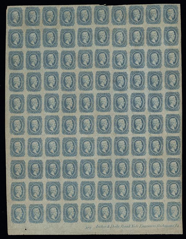 #11, 10c Blue, Die A, unused full left pane of 100 with "No. 2 Archer and Daly Bank Note Engravers, Richmond, Va." inscription at bottom, clear to large margins virtually all around barely nicking one stamp at top, surprisingly fresh with bright color and only a few wrinkles in bottom selvage, very fine.