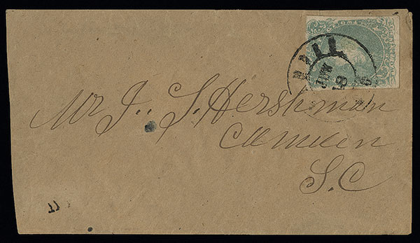 #3, 2c Green, with three large margins, barely touched at top tied to small drop cover by "Camden/S.C./Jun 18" c.d.s, small corner crease to stamp at bottom right, fine and a scarce stamp on cover..