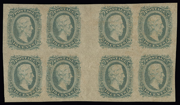 #11c, 10c Bluish green, Die A, two blocks of four with vertical gutter between, full even large margins all around, pristine fresh, o.g., n.h., extremely fine; 2011PF certificate (catalog value is for two gutter pairs and four singles of #11c).