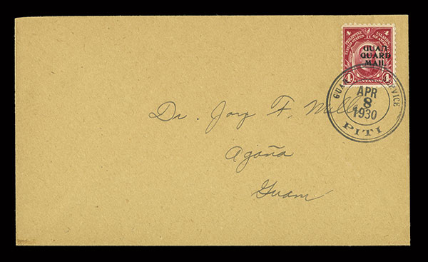 #M2, 4c Carmine with "Guam/Guard/Mail" overprint, the scarce first type of overprint tied to First Day Cover by "Guard Mail Service/Piti/Apr 8 1930" triple-circle c.d.s. to Agana, Guam, fresh and fine; only 3,000 of this value issued.
