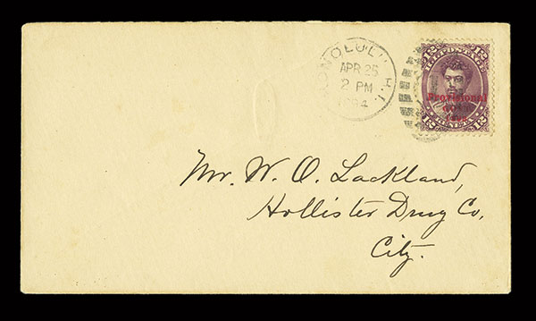 #63, 12c Red lilac Provisional Govt. issue, exceptionally well-centered example of this scarce value, tied by "Honolulu, H.I./Apr 25, 94" duplex to a very clean locally run cover, very fine and choice; a difficult stamp to find in a single franking; 2011 PF certificate.