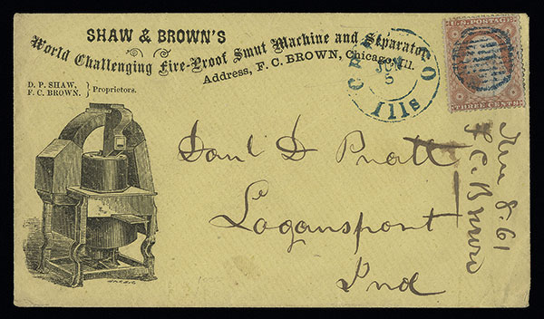 #26, 3c Dull red, Ty. II, well centered single tied to illustrated advertising cover to Logansport, Ind. of "Shaw & Brown's/ World's Challenging Fire-Proof Smut Machine and Separator" of Chicago, ill., central blue grid cancel in duplex with "Chicago/Ills/Jun 5" double circle c.d.s., very fine; 2013 PF certificate.
