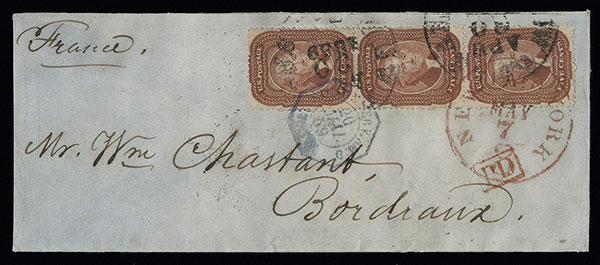 #27, 5c Brick red, Ty. I, unusually choice vertical strip of three with bright color, nicely centered with full perforations that are not scissors separated as is normally found, tied to neat 1859 cover to Bordeaux, France by "New Orleans La./Apr. 30, 1859" c.d.s. pmks. additionally tied by red "New York/Paid 3/May 7" foreign exchange c.d.s. and ultramarine octagonal French entry handstamp, numerous transits and backstamped on reverse, barely apparent repaired tear to cover at bottom into "Bordeaux" of the address, otherwise very fine and exceptionally attractive; the 5c Brick red is very scarce in such a multiple on cover; 2010 PF certificate.