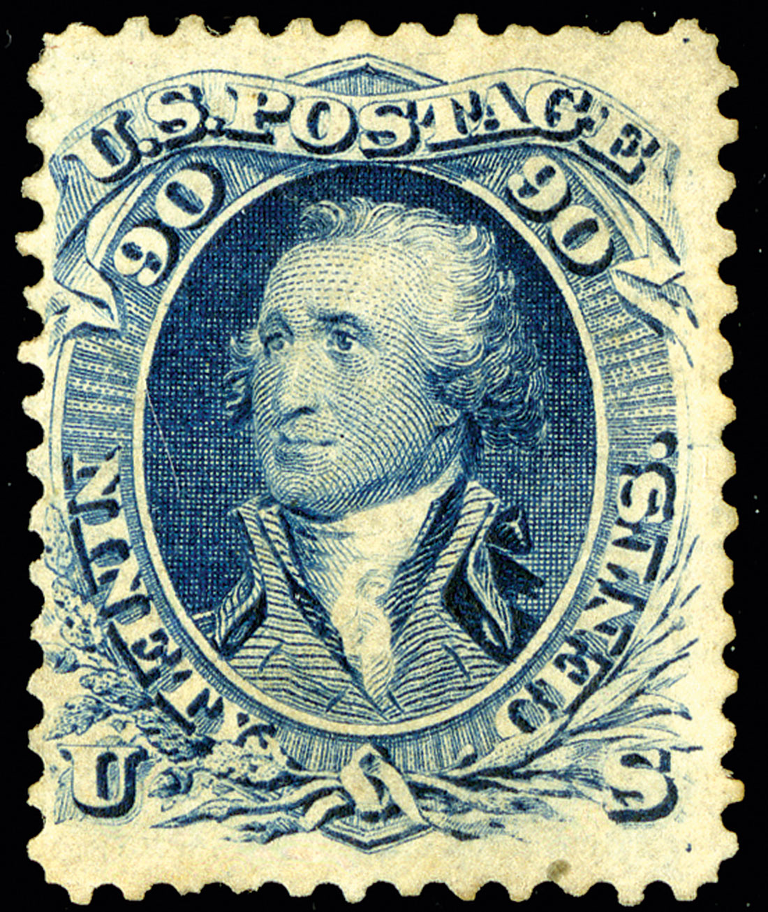 #72, 90c Blue, mint single with intense deep color, disturbed o.g., reperforated at right, fine appearance and a scarce mint high value; 2014 PF certificate.