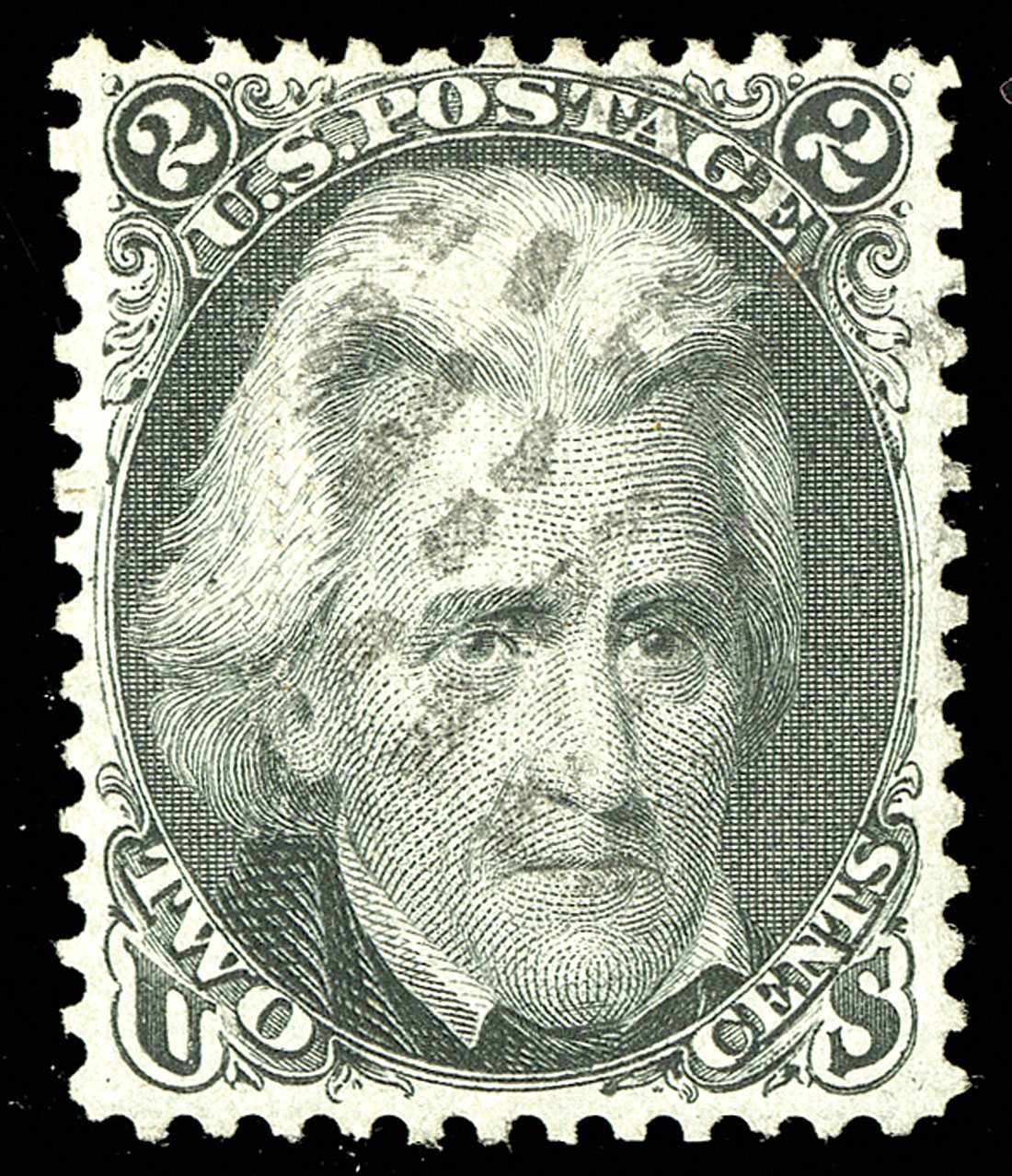 #84, 2c Black, "D" grill, a particularly fresh used example of this rare grill, strong rich color and a highly detailed impression, quite well centered for this and actually better centered than the vast majority of "D" grills, most of which have the perforations strongly cutting into the design, very lightly and unobtrusively cancelled, well defined grill, very fine; 1998 PF certificate.