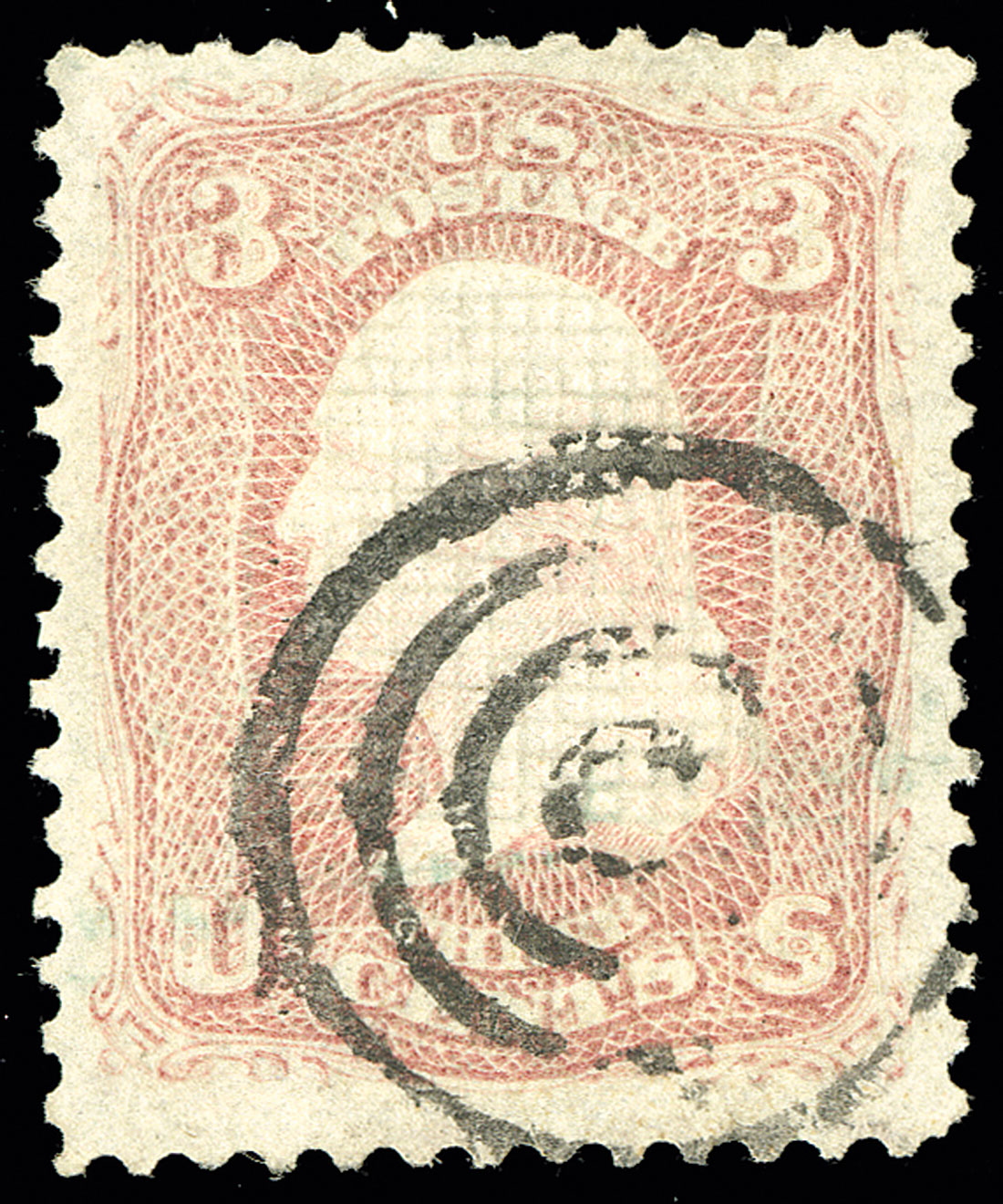 #85C, 3c Rose, "Z" grill, used single that is quite well centered for this scarce grill and larger margins than typically found on this stamp, fresh color, neat target cancel, nearly very fine; 1989 PSE certificate.