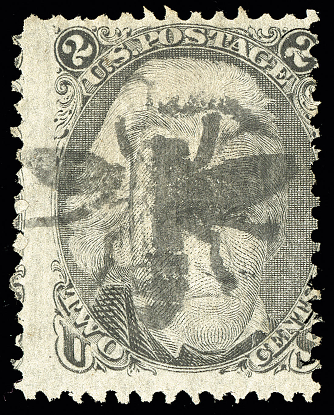 #93, 2c Black, "F" grill, used, centered into perfs. at right, possessing a beautiful central strike of a fancy Bee cancel, attractive and scarce so well struck.