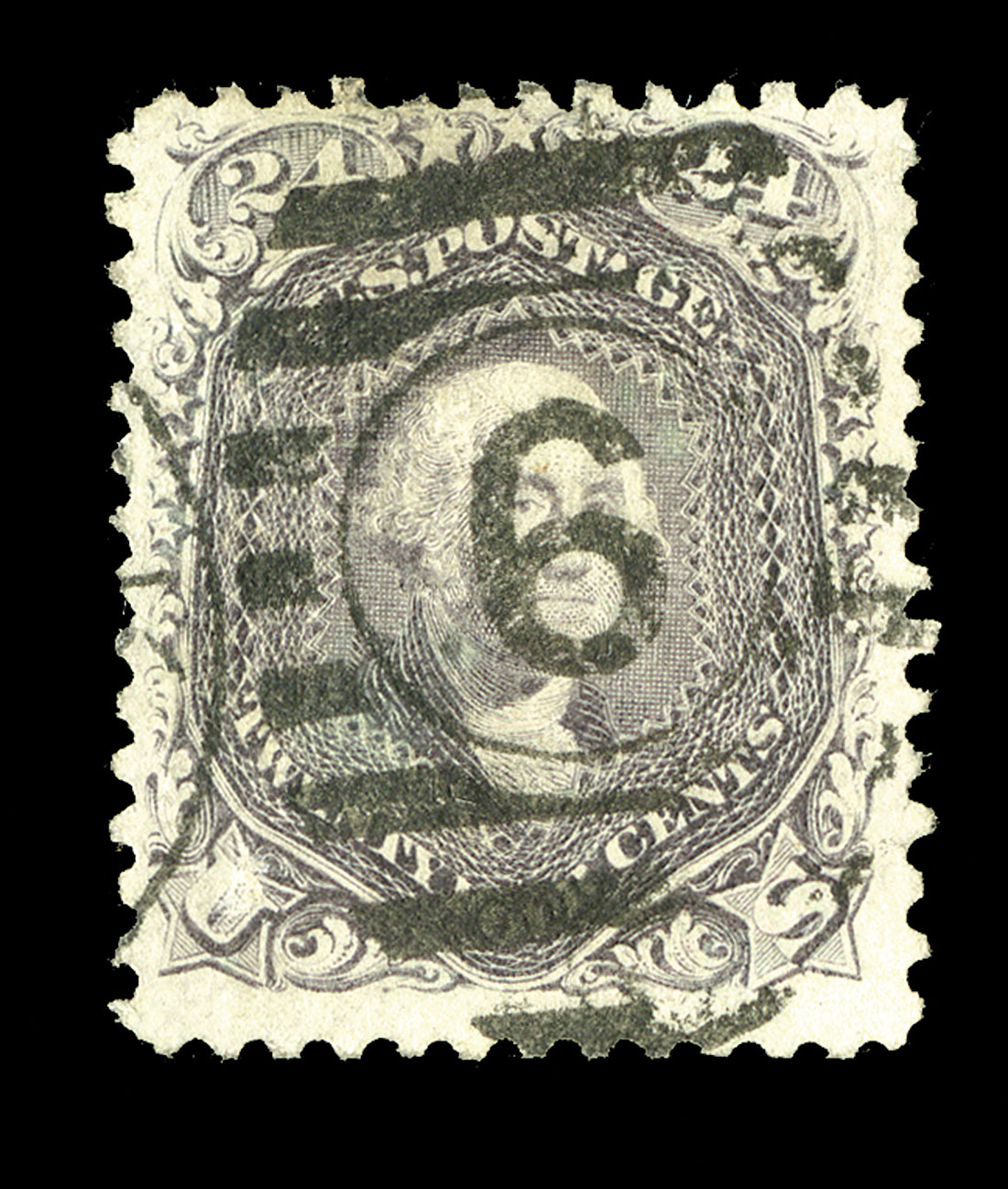 #99, 24c Gray lilac, "F" grill, used, nicely centered within large margins, strong color, well defined grill, and in addition attractively cancelled by centrally struck canceller of a New York numeral "6" duplex, nearly very fine; 2014 PF certificate.