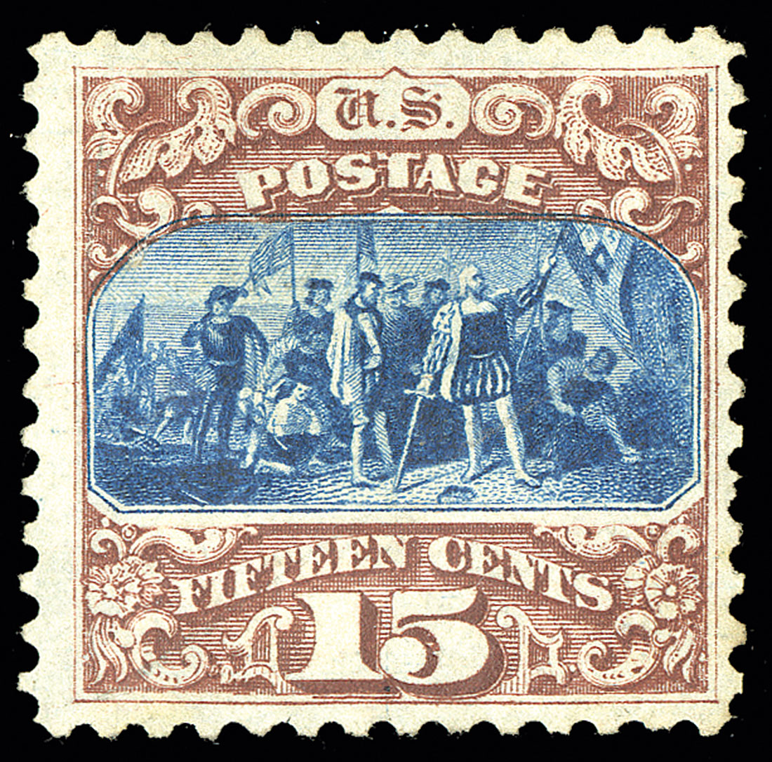 #129, 15c Brown and blue re-issue, Ty. III, unused, strong colors, uncommonly well centered within large margins, choice very fine; 1985 PF certificate.