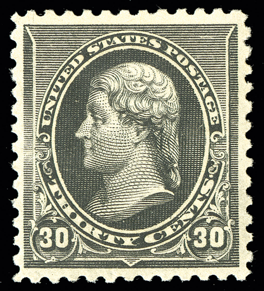 #228, 30c Black, lovely mint single, exceptionally well centered for this difficult value with large margins all around, intense color and detailed impression, o.g., n.h., extremely fine; a handsome example of this high value; 1996 and 2006 PF certificates.