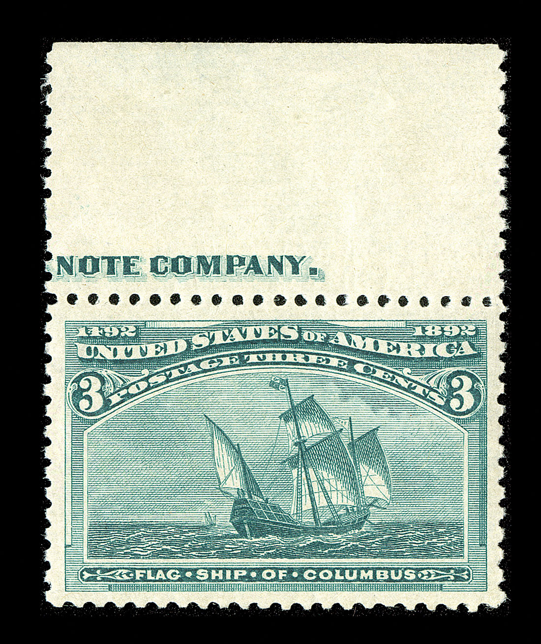 #232, 3c Columbian, top margin partial imprint single ,featuring margins of extraordinary size and being incredibly well centered within them, gloriously rich color and a highly detailed impression on bright white paper, pristine o.g., n.h., extremely fine; 2014 PSE certificate (XF-90 Jumbo; SMQ $200.00 as 90 and $500.00 as 95).