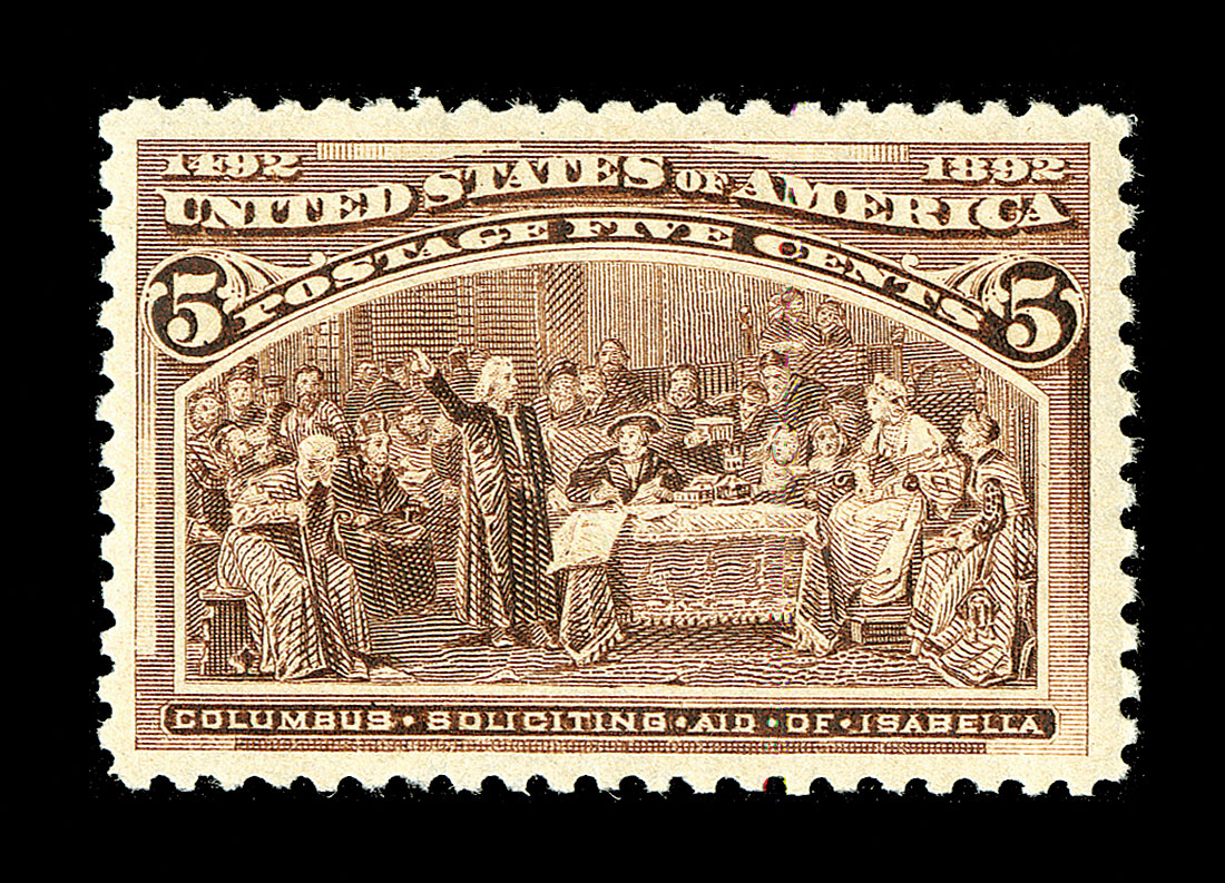 #234, 5c Columbian, an impressive mint example that is exceptionally well centered within especially wide margins, rich luxuriant color and a crisp detailed impression, o.g., n.h., extremely fine and quite choice; 2013 PSE certificate (XF 90; SMQ $500.00).