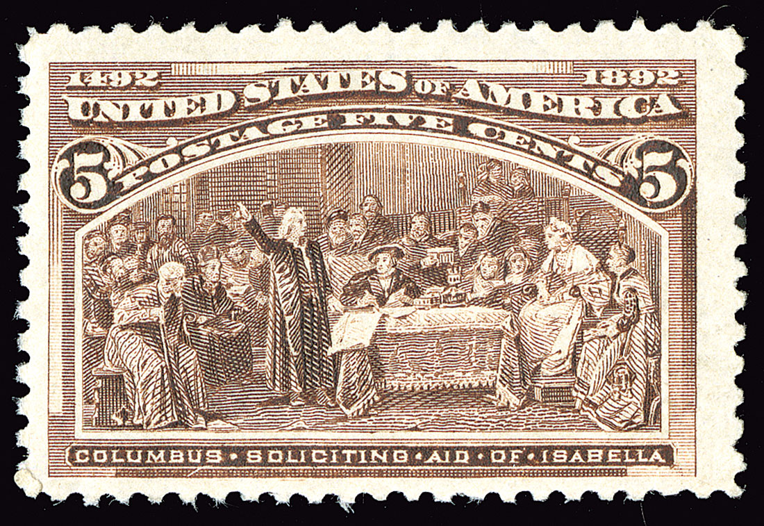 #234, 5c Columbian, an impressive mint example that is exceptionally well centered within especially large margins, rich luxuriant color and a crisp detailed impression, o.g., n.h., extremely fine jumbo; 2014 PSE certificate for a block of four, this being the top right stamp.