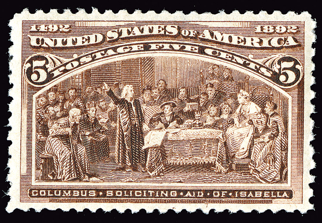 #234, 5c Columbian, pristine mint single, exceptionally well centered, rich color and detailed impression, o.g, n.h., extremely fine; 2011 PSAG certificate for a block of six, this being the top center stamp.