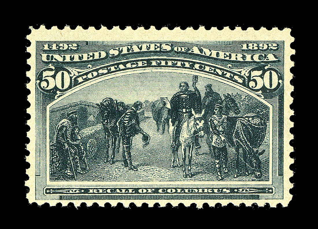 #240, 50c Columbian, an exceedingly fresh mint example, with strong color and an unusually clean impression, rather well centered and margined, o.g., n.h., very fine; never hinged 50c Columbians are truly scarce; 2014 PF certificate.