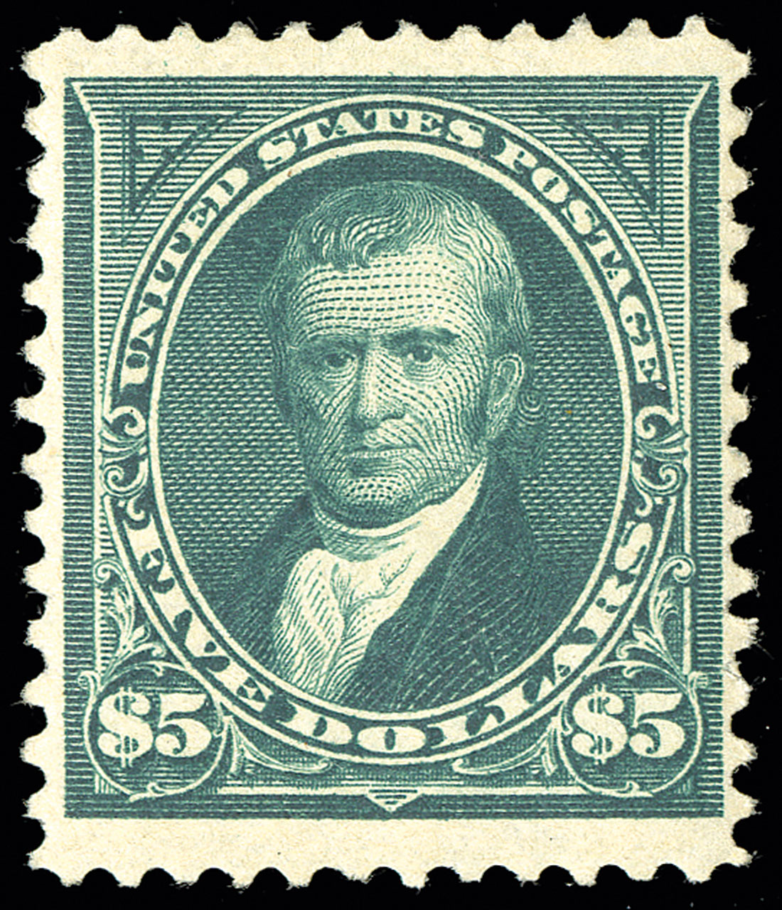 #263, $5.00 Dark green, well centered within uncommonly large margins, rich luxuriant color, slightly disturbed o.g., a very fine example of this scarce high value; clear 1986 PF certificate.