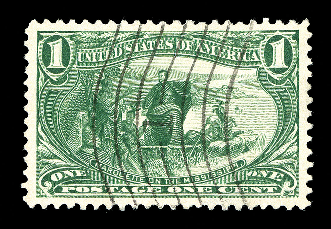 #285, 1c Trans-Mississippi, handsome used single, marvelously fresh and bright, rich color, outstanding centering and large over-sized margins, neat portion of machine cancel; extremely fine and exceedingly choice; 2014 PSE certificate (XF-Superb 95 Jumbo; SMQ $300.00 for 95 and $850.00 for 98).