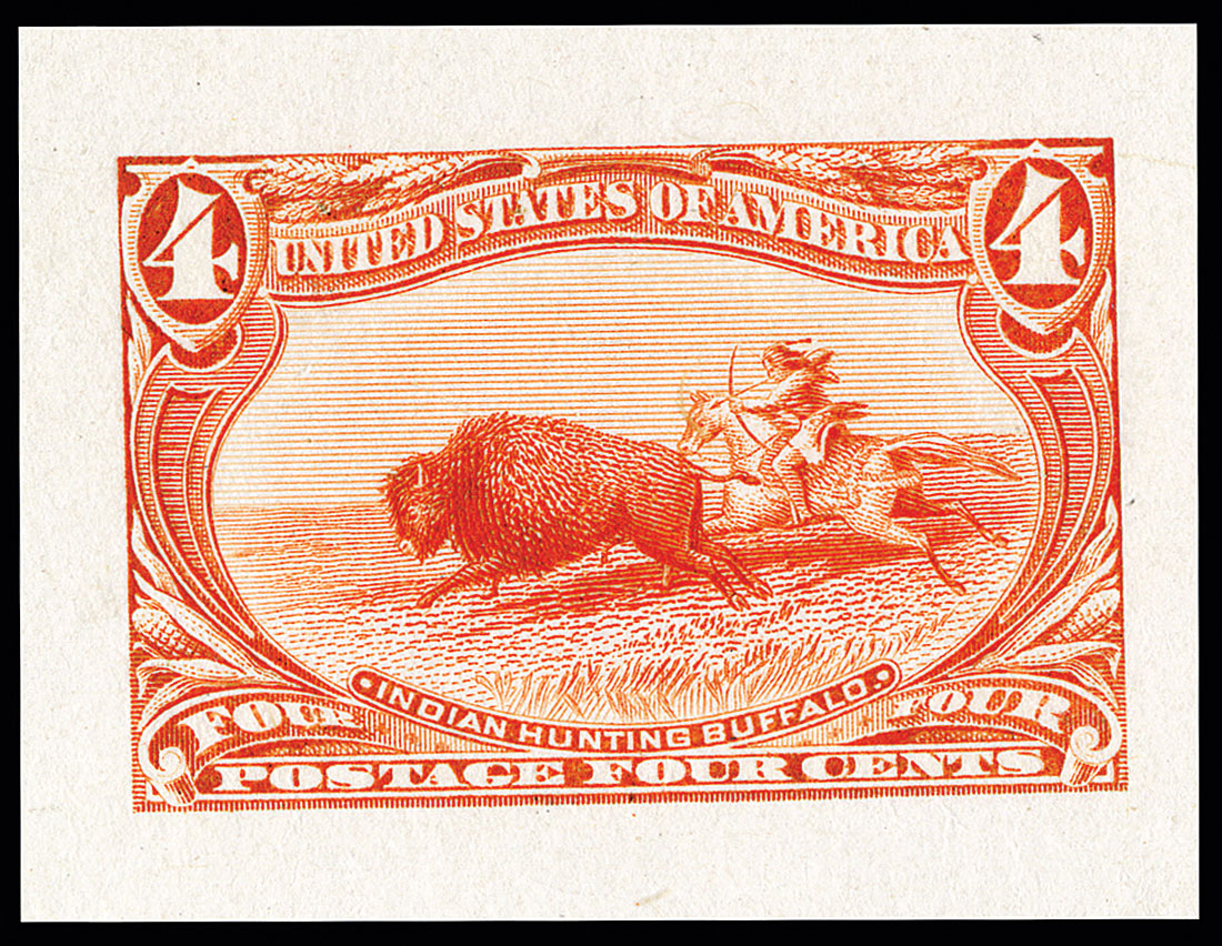 #287P1, 4c Trans-Mississippi, large die proof on India, die sunk on card that is slightly larger than the die sunk area (4"x3"), fresh color and attractive, very fine.