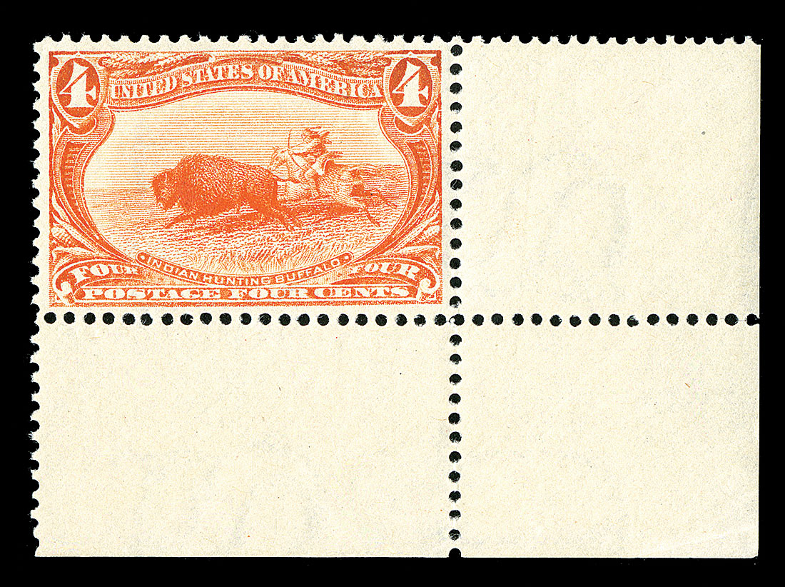 #287, 4c Trans-Mississippi, handsome bottom right corner margin single, exceedingly well centered within large margins, wonderfully bright color, o.g., n.h., extremely fine; 2013 PSE certificate (XF 90; SMQ $625.00).