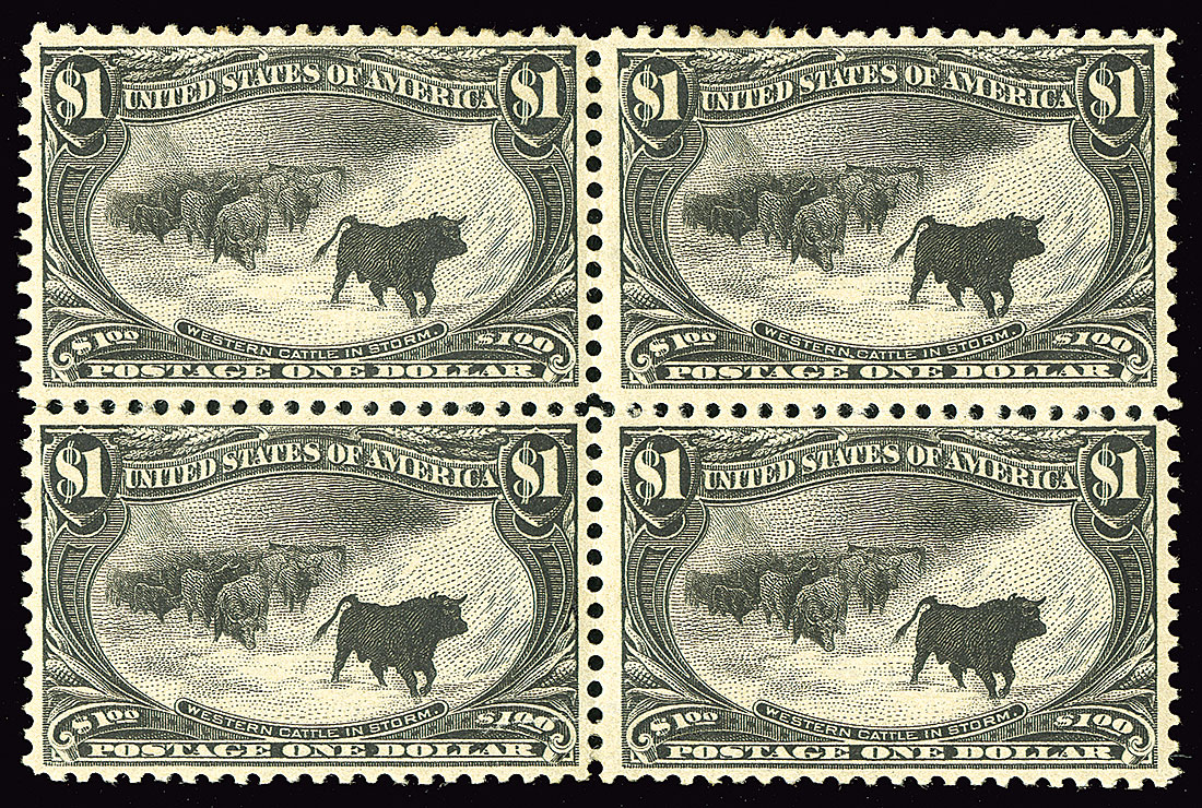 #292, $1.00 Trans-Mississippi, unusually fresh and attractive appearing mint block of four, excellent deep black color and detailed impression on bright paper, o.g., top pair lightly hinged and bottom pair with small hinge thin, very fine appearance and rarely found in blocks.