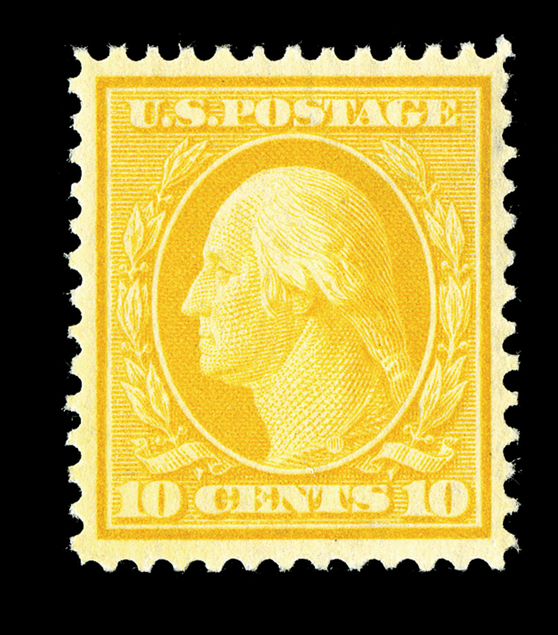 #338, 10c Yellow, well centered within large margins, brilliant color on crisp white paper, unblemished o.g., n.h., extremely fine; 2014 PSE certificate (VF-XF 85; SMQ $225.00).