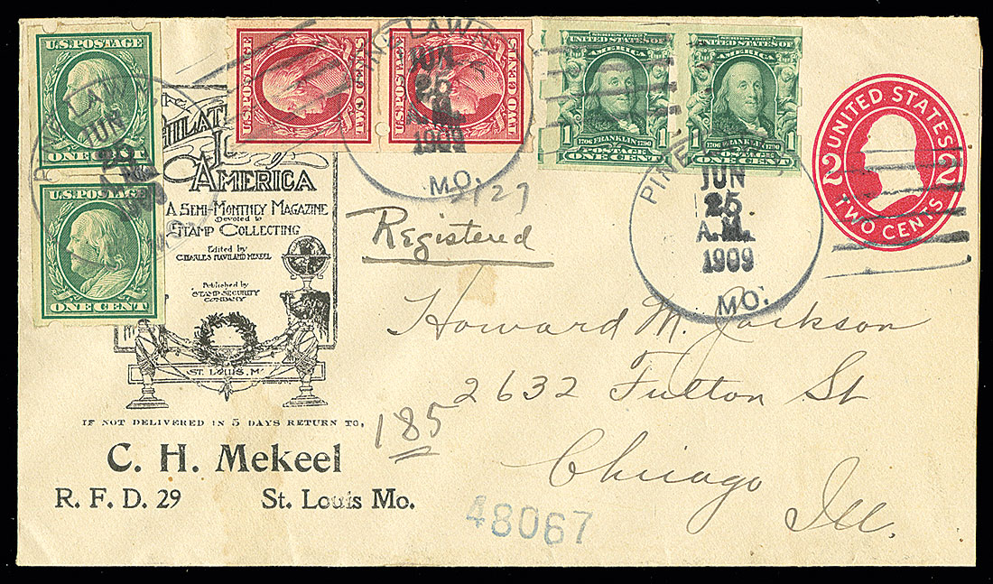 #343, 344 1c Green and 2c Carmine imperforates with Brinkerhoff Ty. IIa vending machine perforations, vert. pairs of each along with a horiz. pair of 1c Blue green (#314) with Schermack Ty. III perforations, all tied to illustrated registered advertising 2c Postal entire (#U411c) of Mekeel's stamp magazine by "Pine Lawn/MO./Jun 25 1909" h.s. cancels, to Chicago, Ill., backstamped, very fine; Mekeel's was a contemporary Philatelic company with the private vending machine issues, both using and expertizing them at the time; a very rare usage of pairs on cover paying a legitimate registry rate.