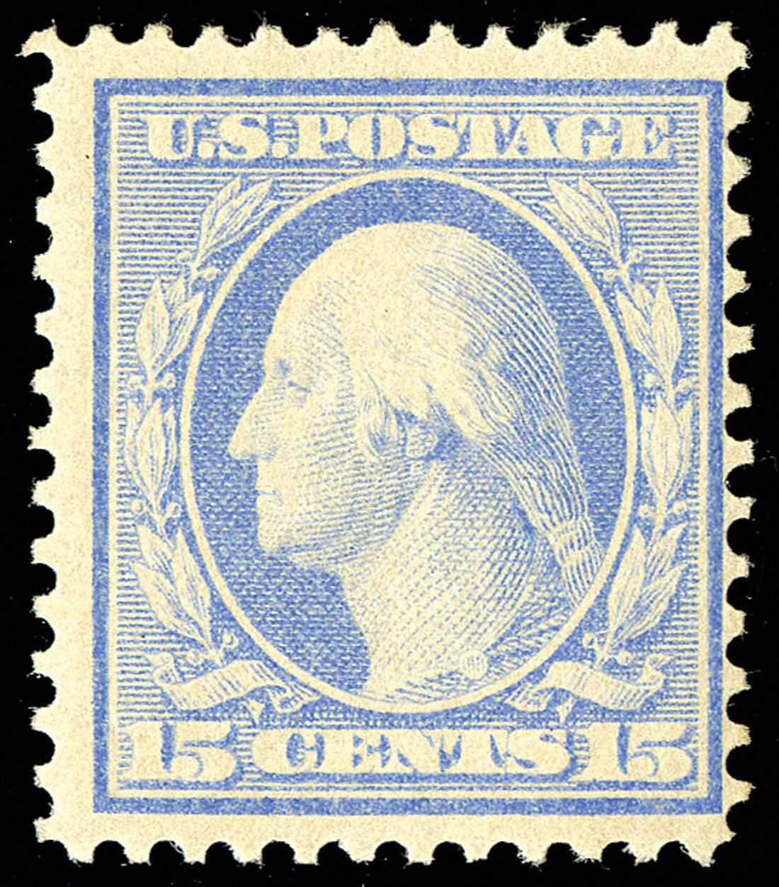 #366, 15c Pale ultramarine on bluish paper, exceptionally fresh mint single, intense color and impression, o.g., n.h., fine centering; one of the few examples that yet remains never hinged; signed Mekeel and accompanied by 1978 PF certificate.