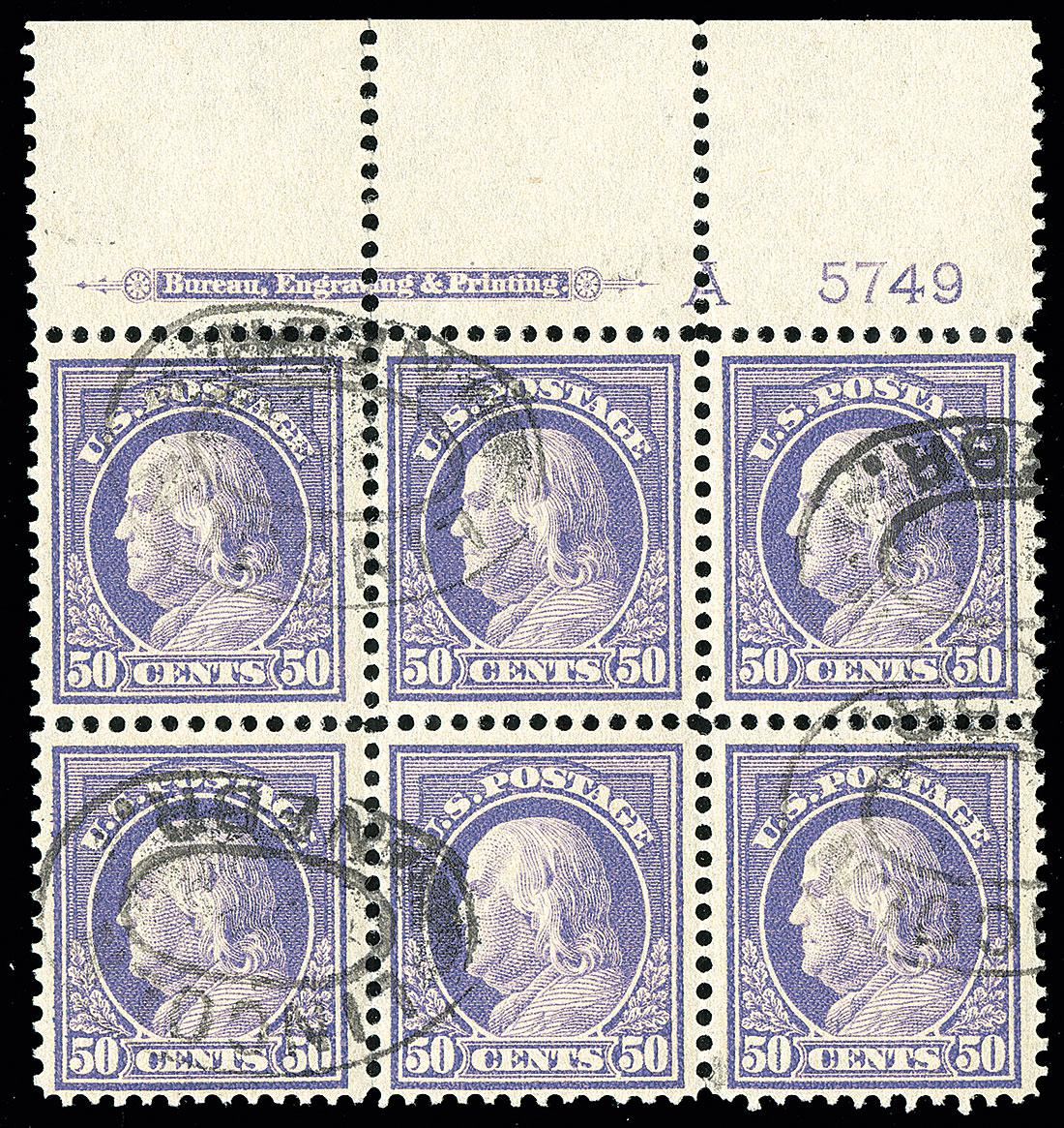 #422, 50c Violet, double line watermark, top margin imprint, letter "A" and plate no. 5749 plate block, cancelled with "Lincoln, Nebr." double oval cancels, fresh with rich color, well centered, few separated vertical perfs. in one row at bottom, very fine; used plate blocks are rarely encountered on these high values.