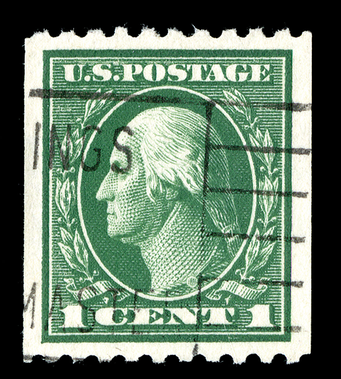 #441, 1c Green flat plate coil, perf. 10 horiz., a striking used single, perfectly centered within large balanced margins, rich color on crisp clean paper, neat portion of a machine cancel, extremely fine; a beautiful gem; 2014 PSE certificate (Superb 98; SMQ $175.00).