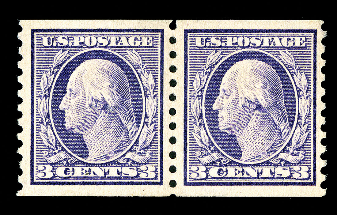 #445, 3c Violet flat plate coil, perf. 10 vert., choice and handsome mint pair of this scarce coil, featuring outstanding centering within unusually wide margins, rich color and prooflike impression on especially bright paper, o.g., lightly hinged, extremely fine; 2003 PF certificate (VF-XF 85; SMQ $650.00).