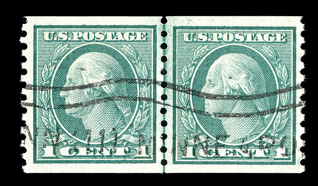 #452, 1c Green rotary coil, perf. 10 vert., select used joint line pair, exceptionally well centered, strong color, neatly cancelled, extremely fine; 2014 PSE certificate (XF 90 Jumbo; SMQ $550.00 for 90 and $1,000.00 for 95).