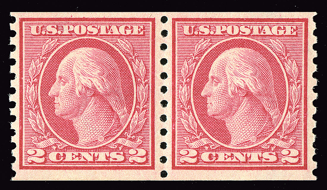 #453, 2c Carmine rose rotary coil, Ty. I, perf. 10 vert., fresh mint pair, deep "fiery" color, o.g., n.h. with a couple of tiny gum skips, very fine; 2003 PF certificate for a strip of three, this being the right pair.
