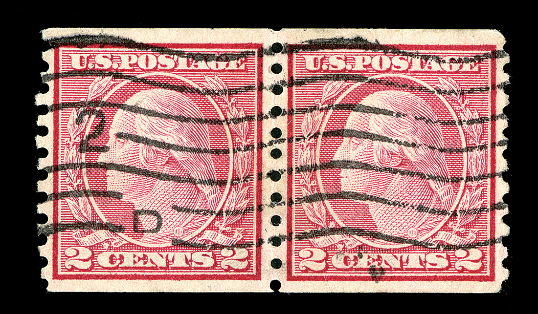 #454, 2c Red rotary coil, Ty. II, perf. 10 vert., used pair, well centered, brilliant red shade, wavy line machine cancel, extremely fine; 2014 PF certificate (VF-XF 85; SSV $120.00).