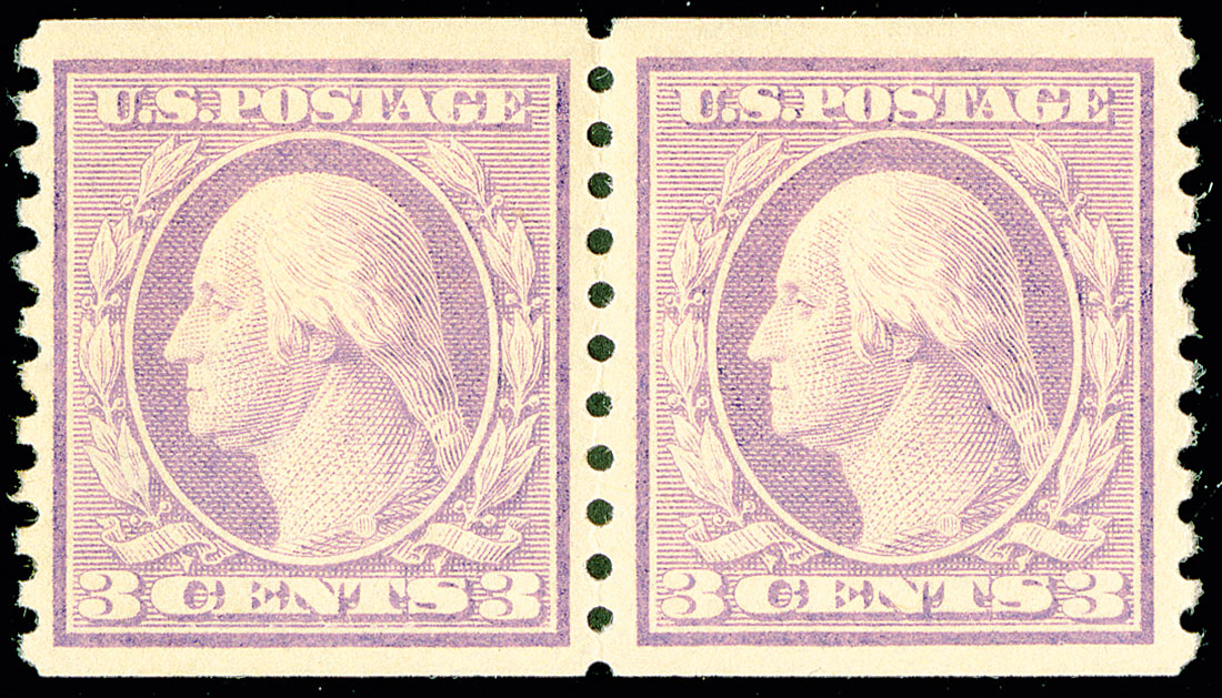 #456, 3c Red violet rotary coil, Ty. I, perf. 10 vert., mint pair, well centered and margined, fresh color in a distinctly red violet shade that is rarely encountered on this watermarked coil despite the undifferentiated catalog value, o.g., l.h., very fine.