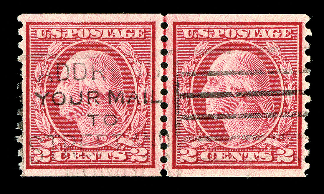 #492, 2c Carmine coil, Ty. III, perf. 10 vert., used joint line pair, extraordinarily well centered and margined, deep intense color, neat machine cancel, extremely fine; used line pairs are actually more elusive than their mint counterparts; 2014 PF certificate.