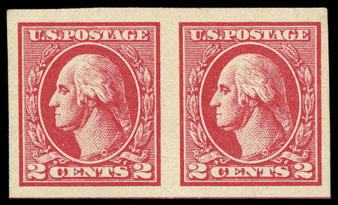 #534B, 2c Carmine offset imperforate, Ty. VII, an especially handsome and fresh horizontal pair of this truly rare 20th century stamp, uniform and lavishly large margins all around, rich color on bright white paper, o.g., lightly hinged, extremely fine;1998 PF certificate.