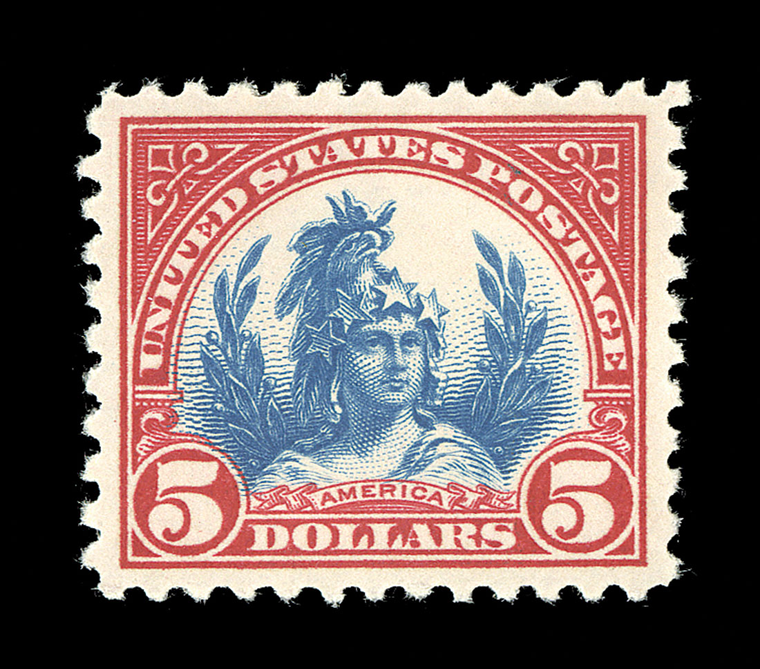 #573, $5.00 Carmine and blue, beautifully centered and margined, bright fresh colors, o.g., n.h., extremely fine; 2013 PSE certificate (XF-Superb 95; SMQ $425.00).