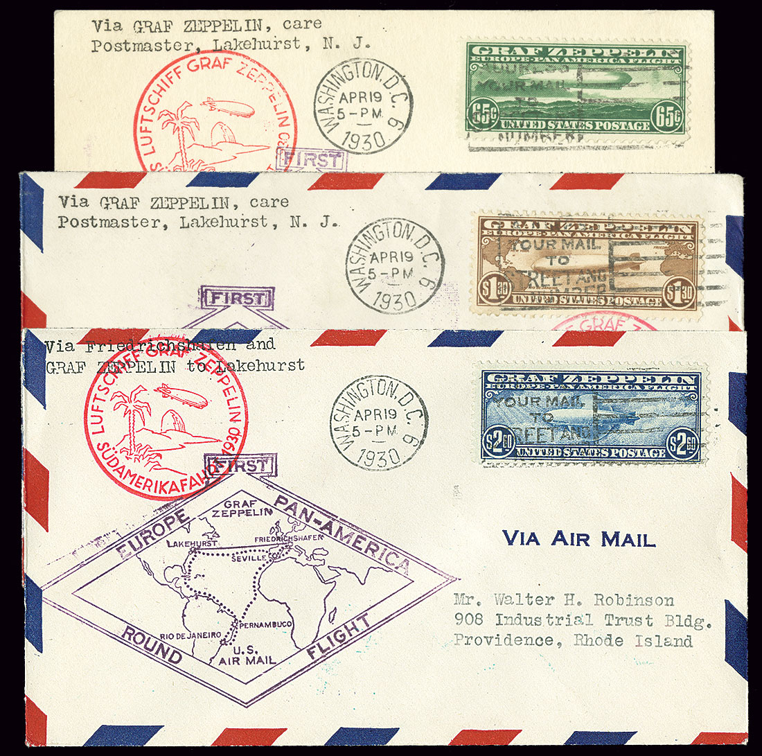 #C13-15, 65c-$2.60 Graf Zeppelins cplt., nicely centered singles tied by "Washington, D.C./Apr 19, 1930" slogan machine first day of issue cancels to fresh flown covers (65c a card), appropriate U.S. and German flight cachets and Friedrichshafen arrival postmarks, extremely fine.
