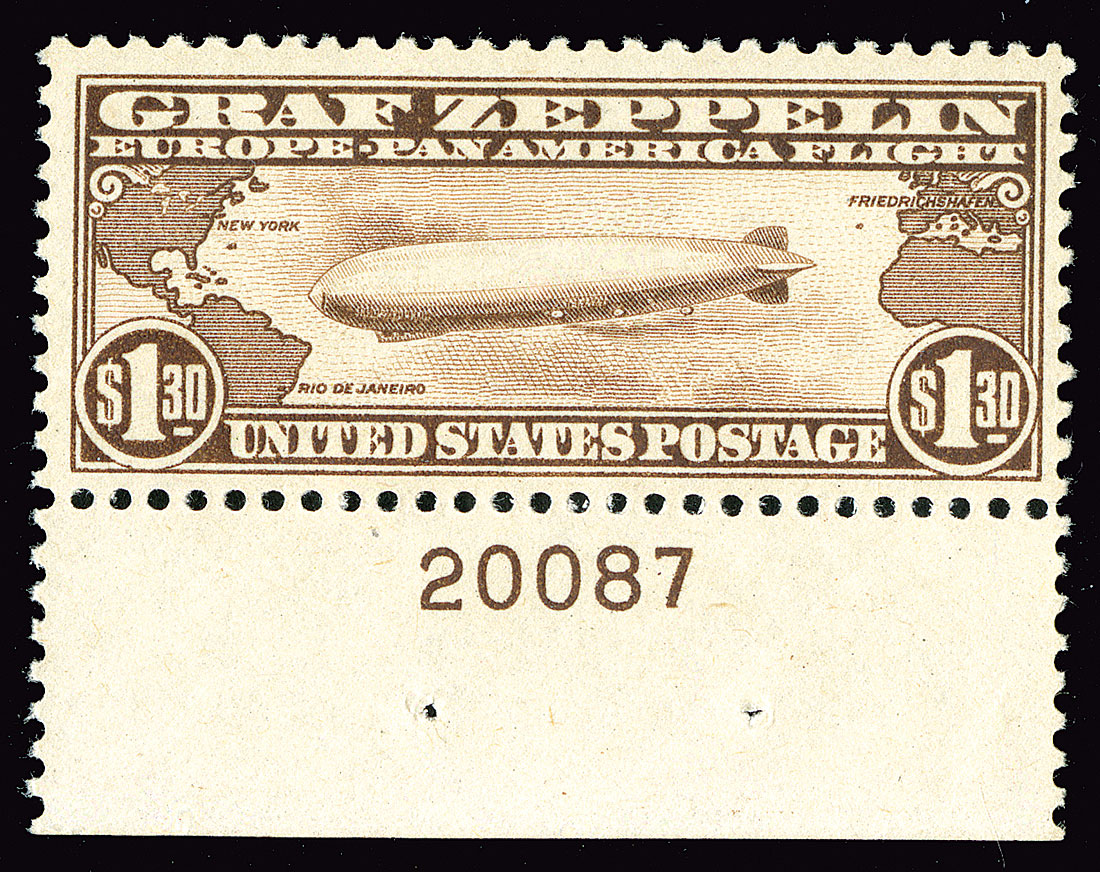 #C14, $1.30 Graf Zeppelin, bottom margin plate no. 20087 single, well centered and fresh, o.g., n.h. small gum skips typical of margin stamps, very fine.
