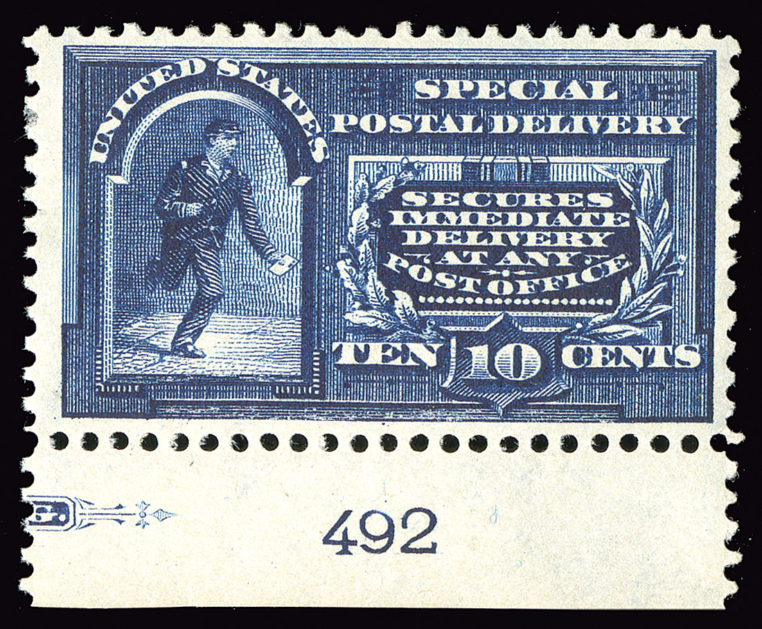 #E5, 10c Blue, four plate number singles, one top with plate no. 883 (n.h.) and three bottom with plate no.'s 125, 381 and 492, all with rich colors but with different intensities and shades, o.g., three l.h. and one n.h., fine -very fine.