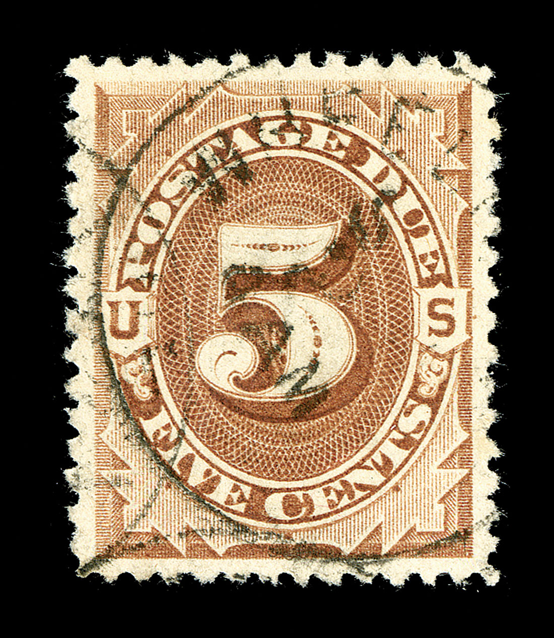 #J4, 5c Brown, a marvelous used example, featuring large and extraordinarily well balance margins which are especially difficult to find on postage due stamps, strong rich color, unobtrusive cancel, extremely fine used gem; 2014 PSE certificate (Superb 98; SMQ $300.00 for 95 the highest grade that is priced); this stamp has been awarded the highest grade in the PSE population report and the only example to be so graded.