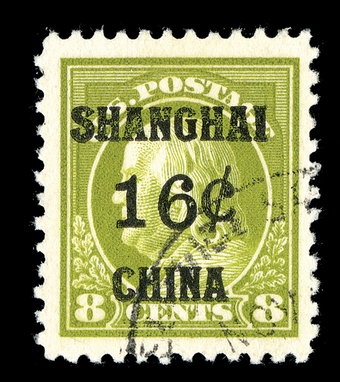#K8a, 16c on 8c Olive green, jumbo-margined used single, being wonderfully well centered within these lavish borders, especially deep and luxuriant color, portion of Shanghai Postal agency c.d.s., extremely fine gem; 2006 PF certificate (XF 90J; SSV $350.00 for 90 and $975.00 for 95).