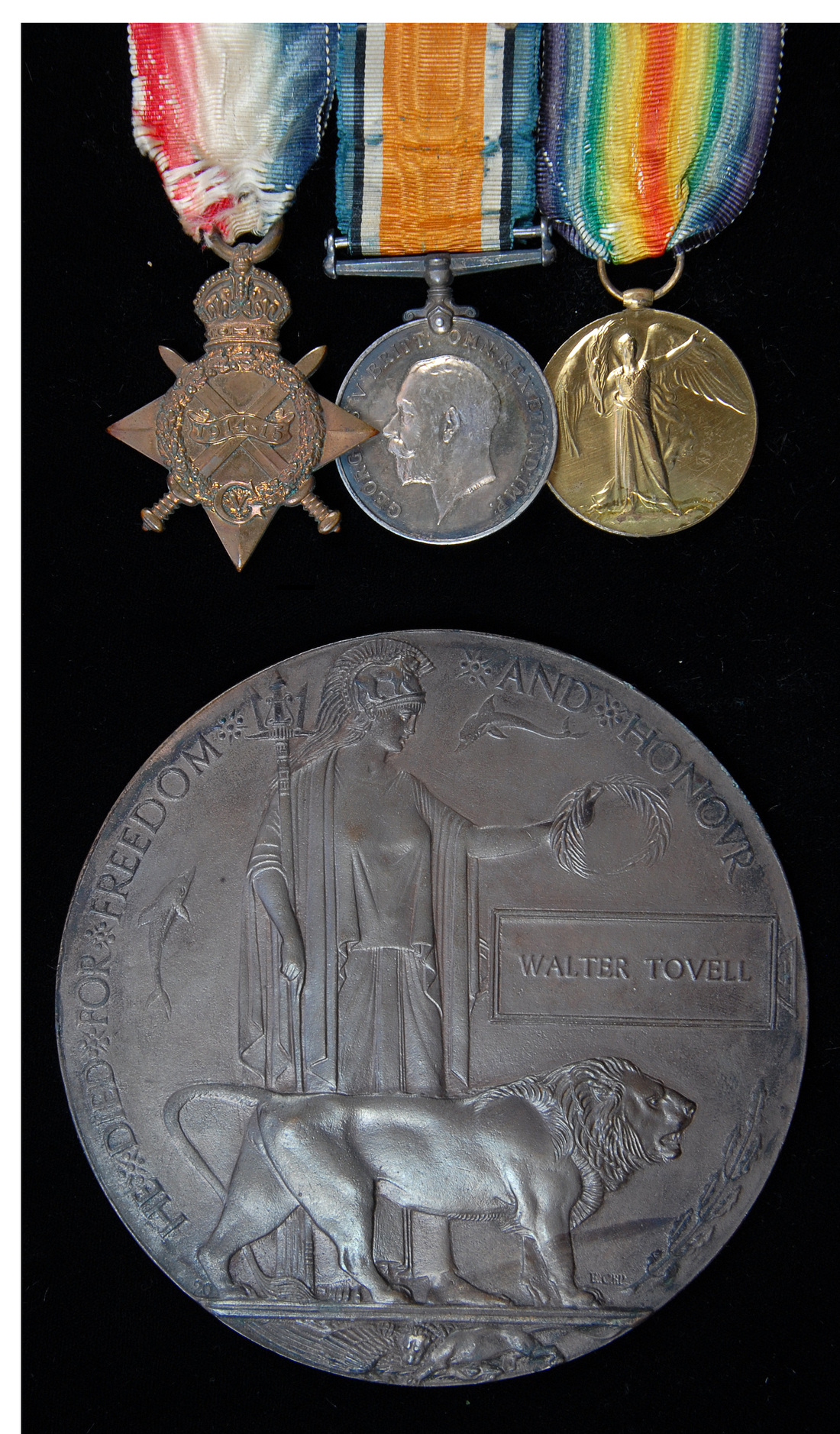 1914-15 Star (W-8527 Pte. W. Tovell. R.W. Kent. R); British War and Victory Medals (S-8527 Pte. W. Tovell. R.W. Kent. R), very fine, with the recipient's Great War Bronze Memorial Plaque (Walter Tovell) and Memorial Scroll 'Pte. Walter Tovell, Royal West Kent Regiment', this damaged; and portrait photograph of the recipient (3)