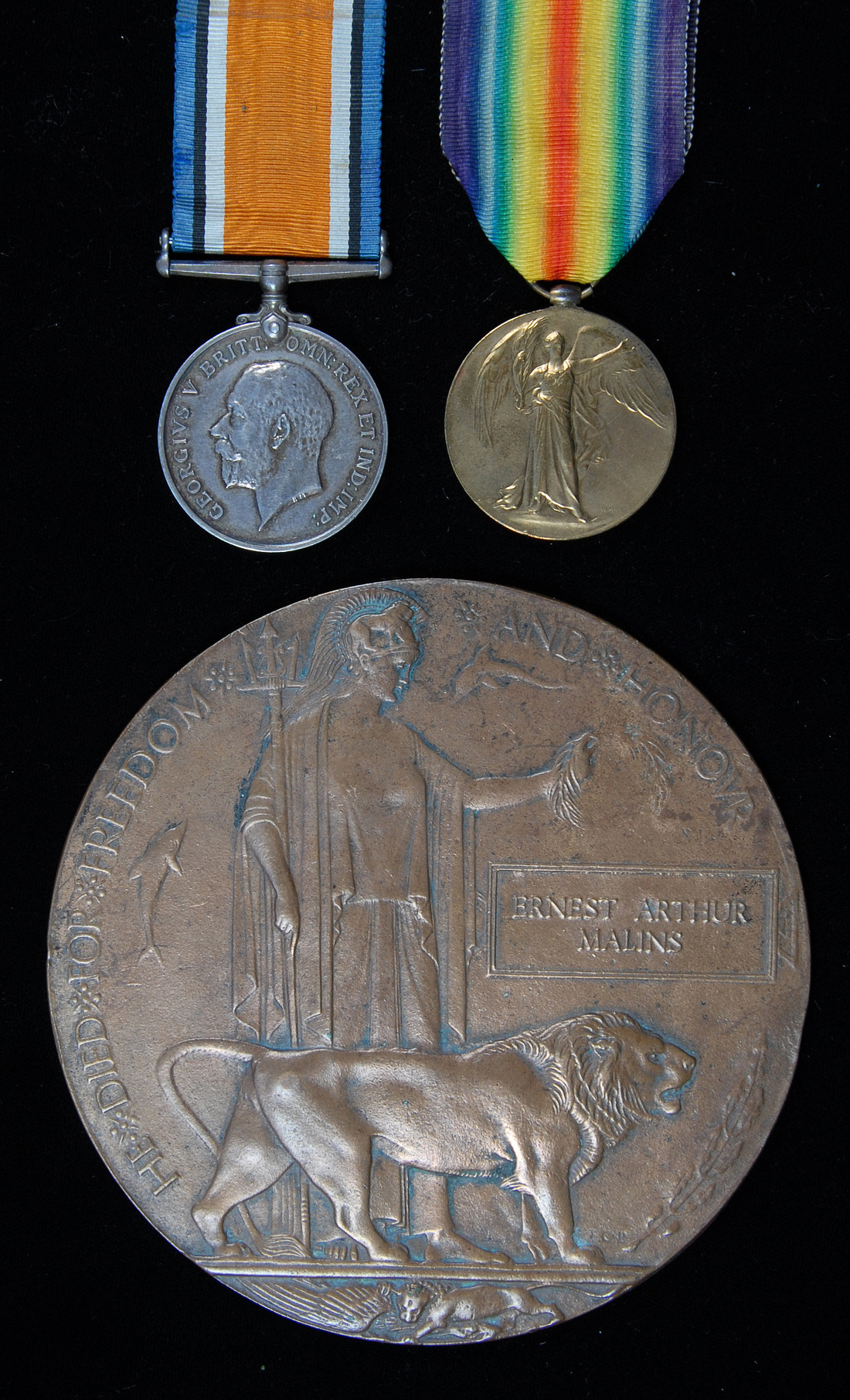 British War and Victory Medals (GS-5793 Pte. E.A. Malins R.W. Kent R.), good very fine, with the recipient's Great War Bronze Memorial Plaque (Ernest Arthur Malins) (2)